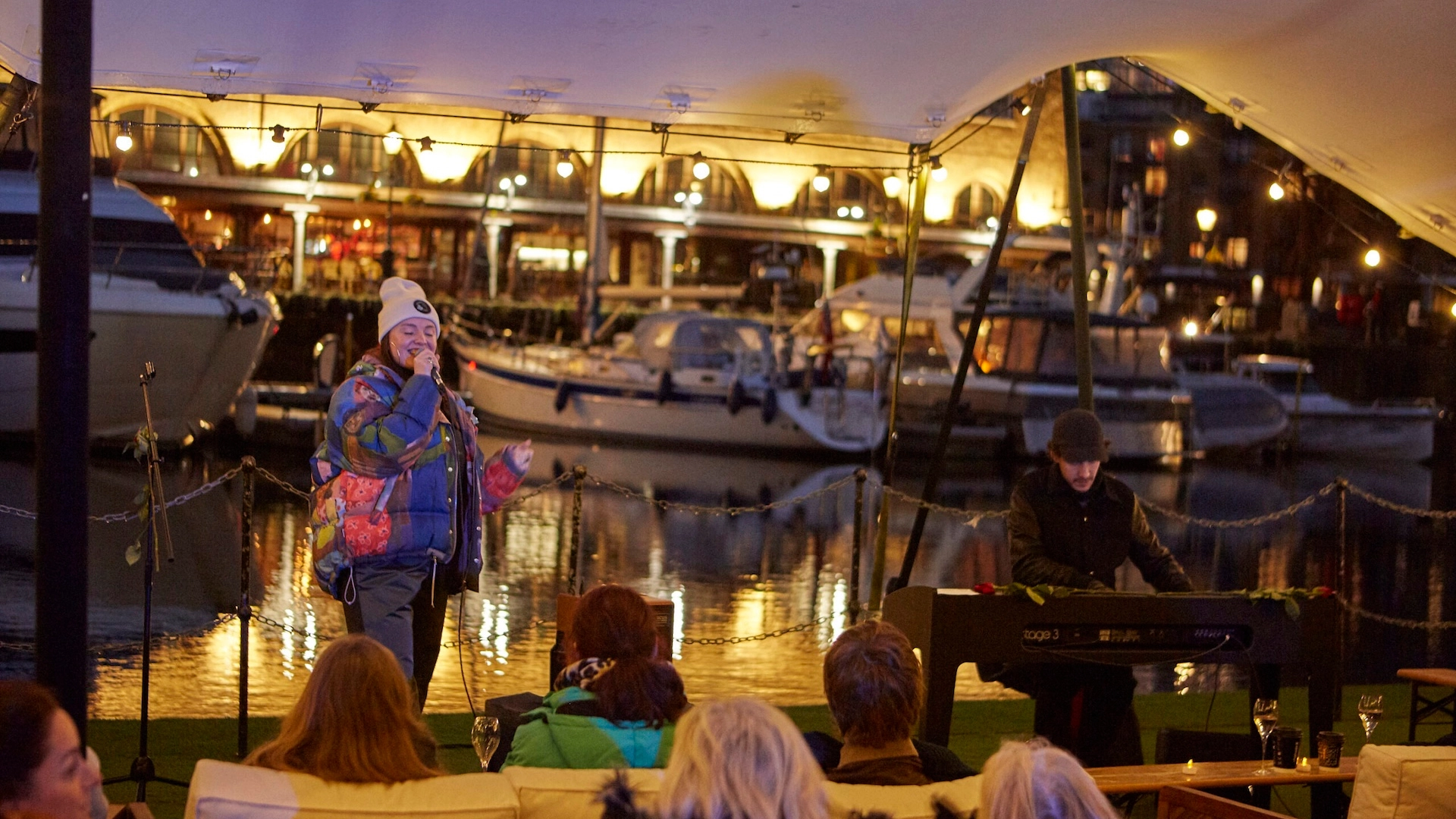 Set on a floating pontoon at St Katharine Docks, the whole thing leans into that low-lit, slightly romantic London feeling. You’re surrounded by the marina, the lights bouncing off the water, a glass in hand, it’s less of a big night out and more of the right night out.
