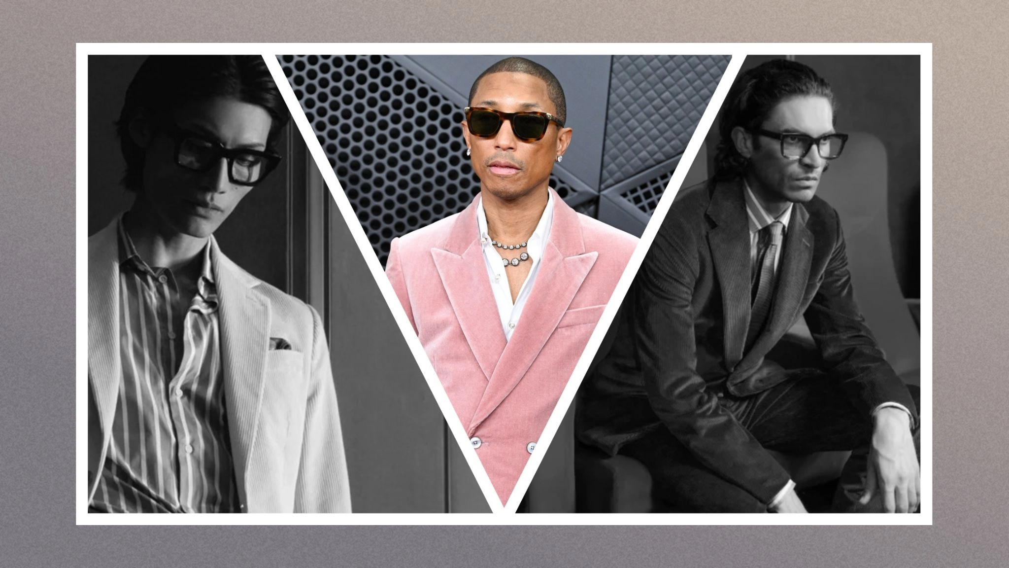 At this year’s Grammys, for example, Pharrell Williams’ suit was in pink velvet, with flares, while Dijon’s suit jacket was asymmetric; at the Golden Globes Chris Perfetti’s electric blue suit was button-less, fastening by way of a giant brooch, while Ollie Muhl’s suit jacket was well below the knee in length. A suit matches top and bottom, but otherwise anything now goes: raglan sleeved, lapel-free, cropped, Velcro-fastened, very, very shiny. There’s been shift in definition that allows the suit to still work as an acknowledgement of the occasion, without insisting every man looks more or less the same.